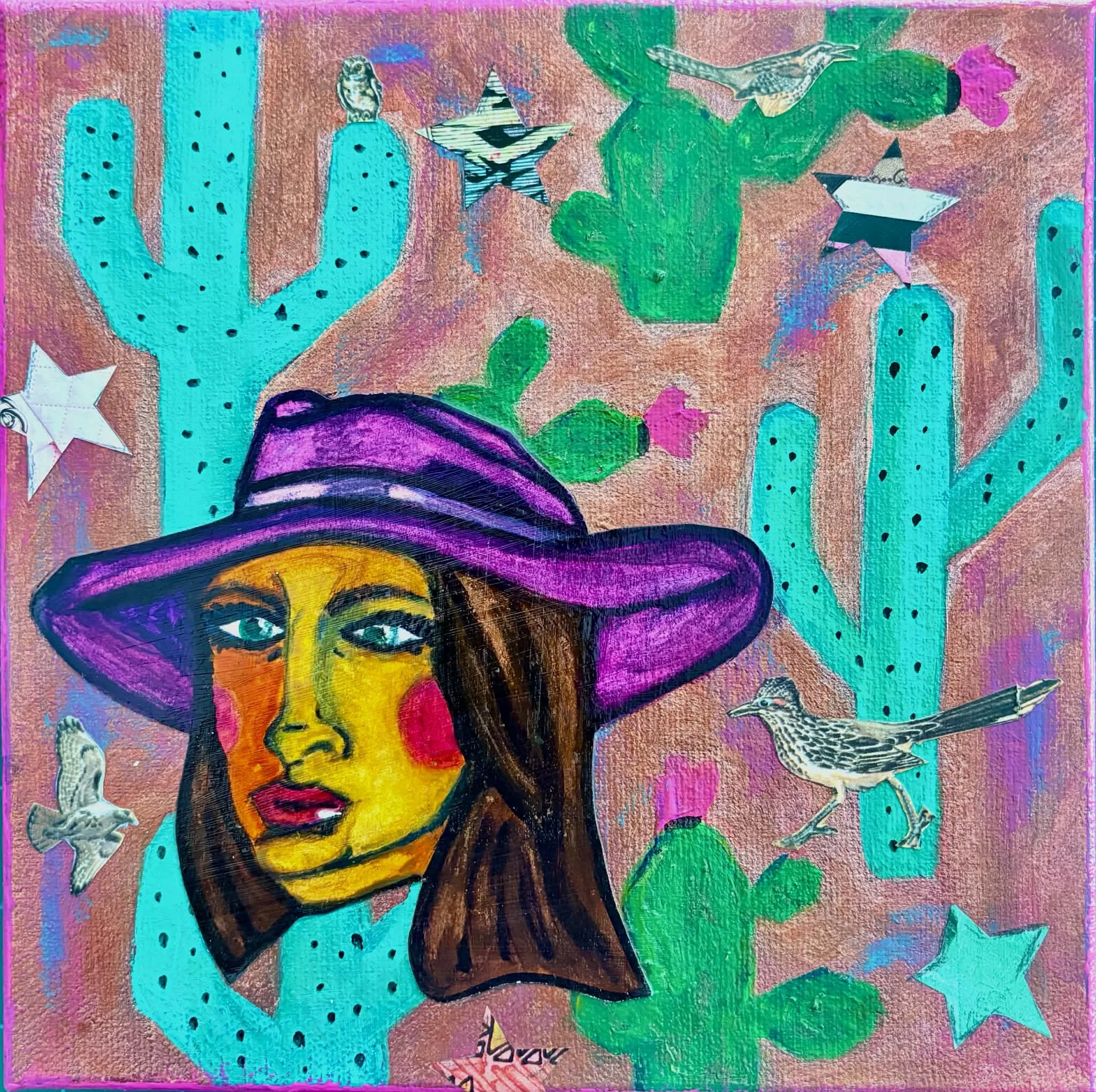 acrylic paint, color pencil, watercolor, vintage & new ephemera, on gallery wrapped canvas, ready to hang